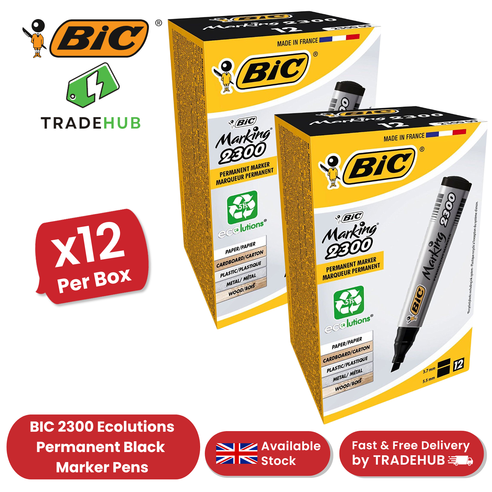 Bic 2300 Permanent Black Chisel Tip Marker (Pack of 12) X2