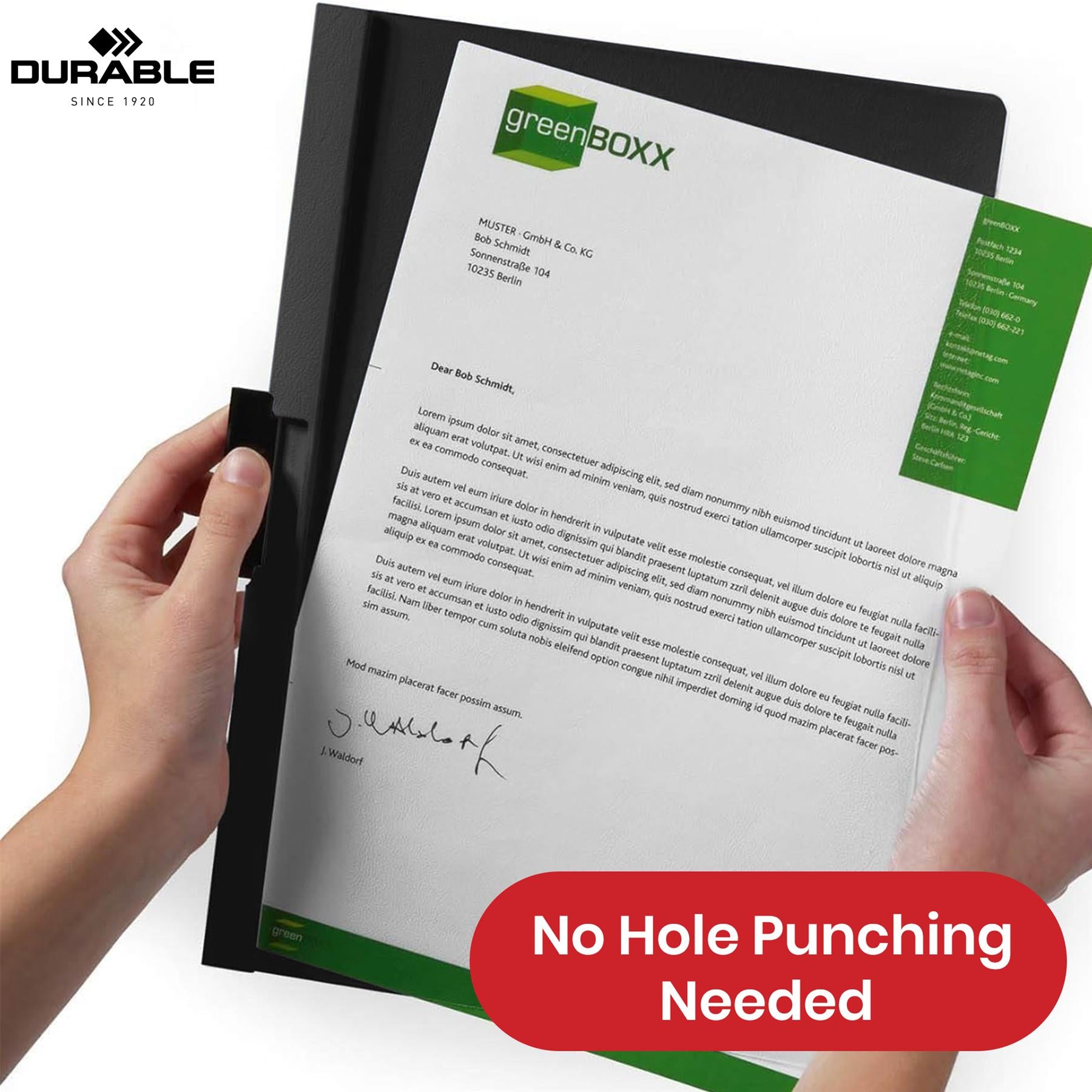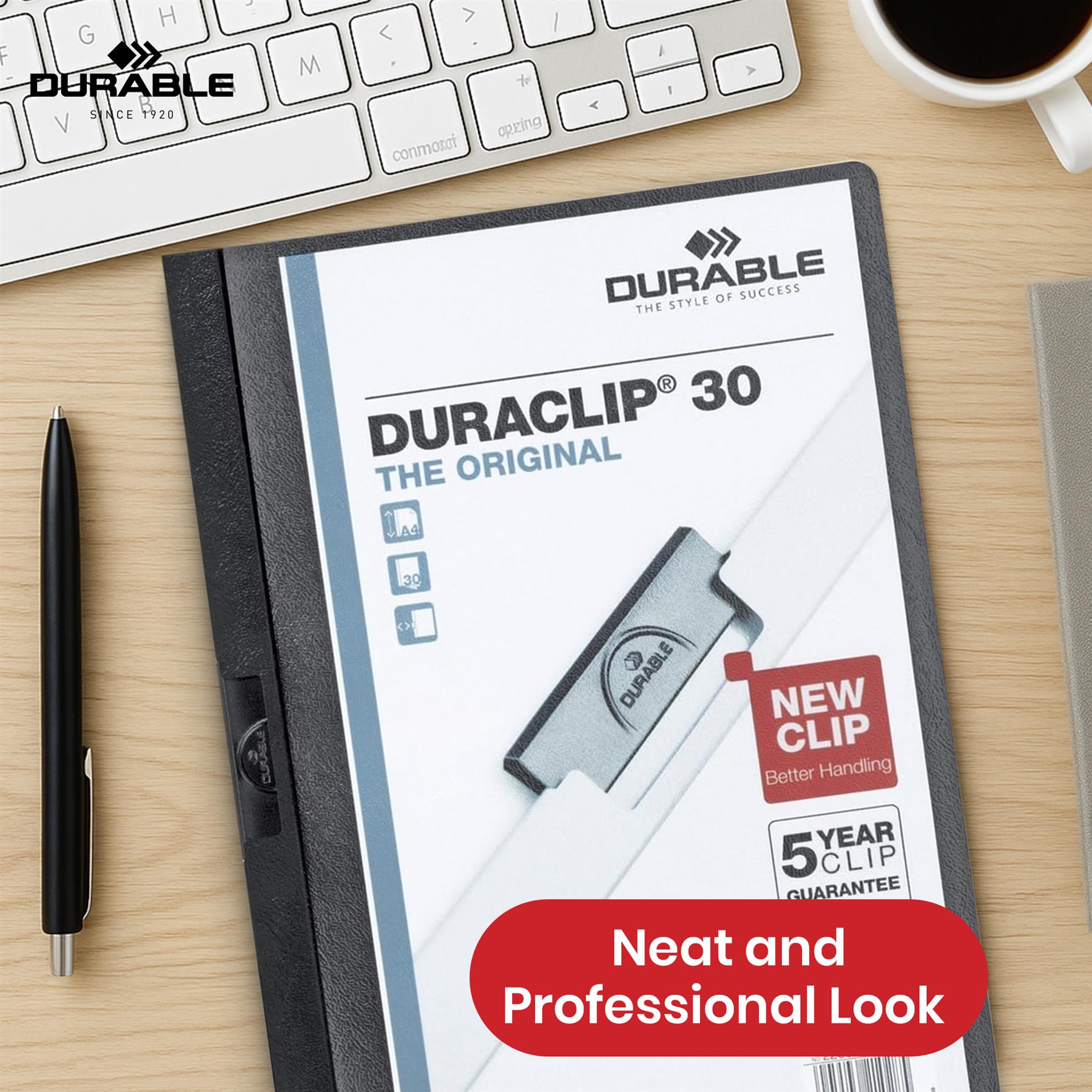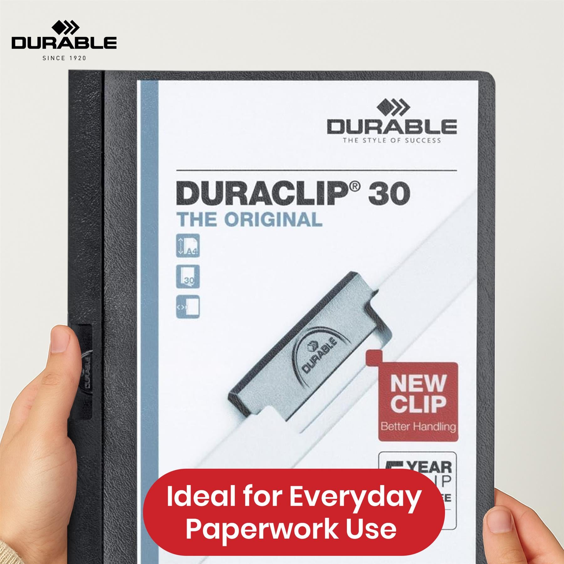 DURABLE A4 CLIP FOLDER – Designed for professionals, students and businesses, the DURACLIP 30 securely holds up to 30 sheets of A4 paper without punching holes. Suitable for creating neat reports, storing project work and presenting documents in meetings or lectures.