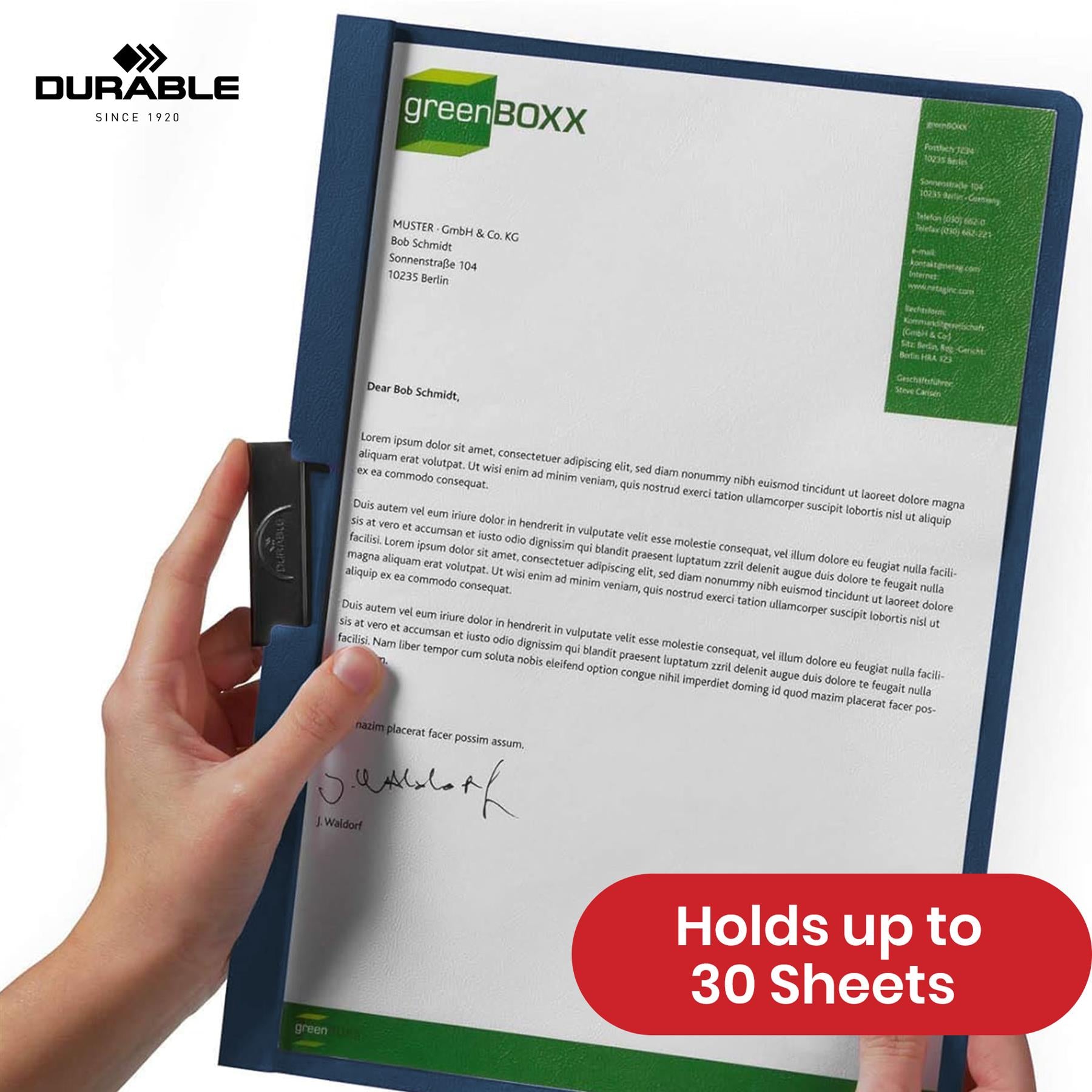 DURABLE A4 CLIP FOLDER – Designed for professionals, students and businesses, the DURACLIP 30 securely holds up to 30 sheets of A4 paper without punching holes. Suitable for creating neat reports, storing project work and presenting documents in meetings or lectures.