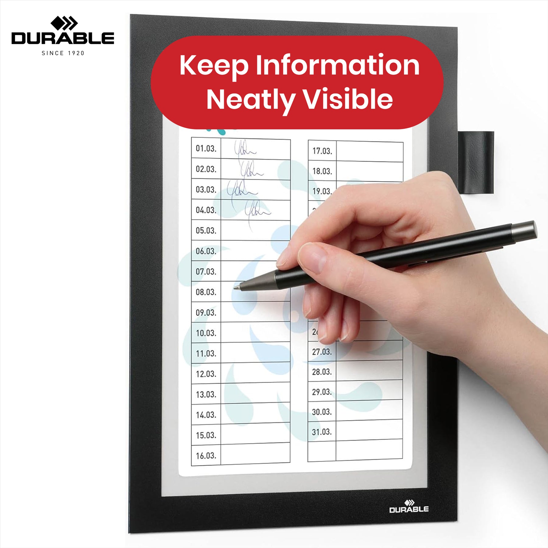 DURABLE A5 BLACK DISPLAY FRAME – Keep important notes, signs and information visible at all times with the photo display frame. Designed for offices, schools and facilities, this A5 magnetic frame makes signage clear, organised and professional without the mess of pins or tapeÂ