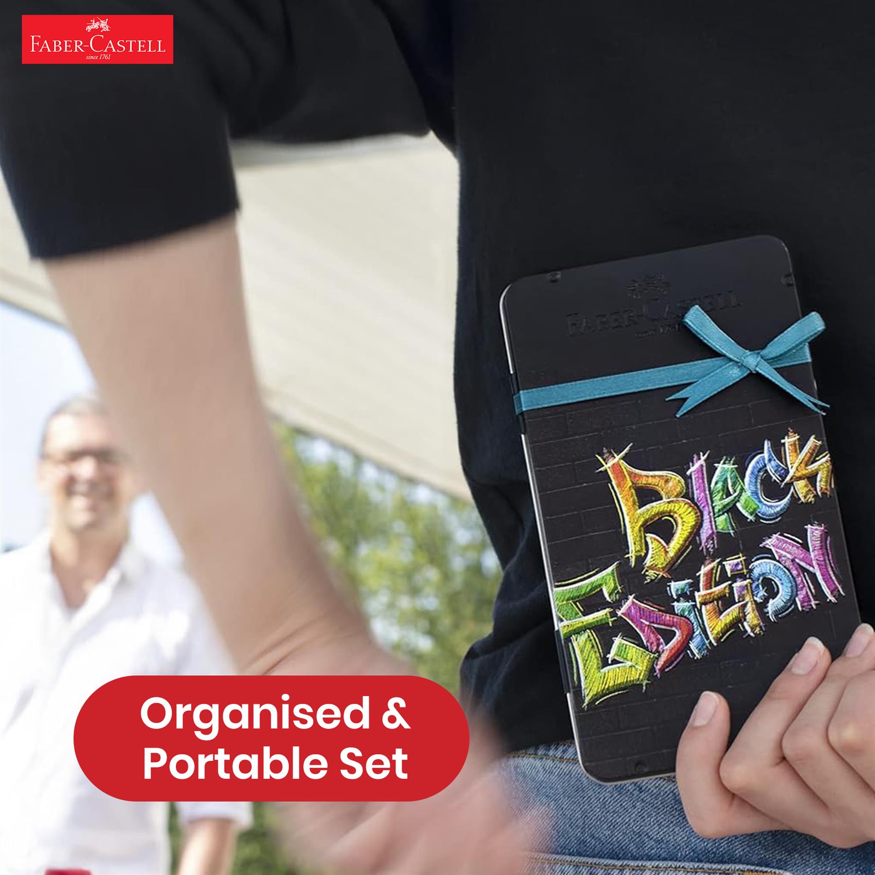 FABER-CASTELL COLOURING PENCILS – Our high-quality coloured pencils are designed for artists, students and hobbyists. This black tin of colour pencils offers vibrant shades for creative projects, schoolwork, sketching and detailed colouring for every creative mind