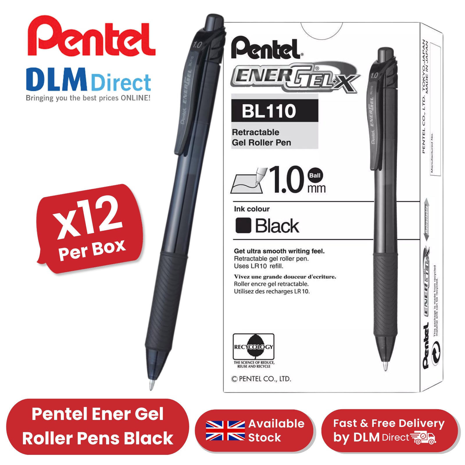 PENTEL ENERGEL RETRACTABLE GEL ROLLER 1.0MM BLACK - Pack of 12