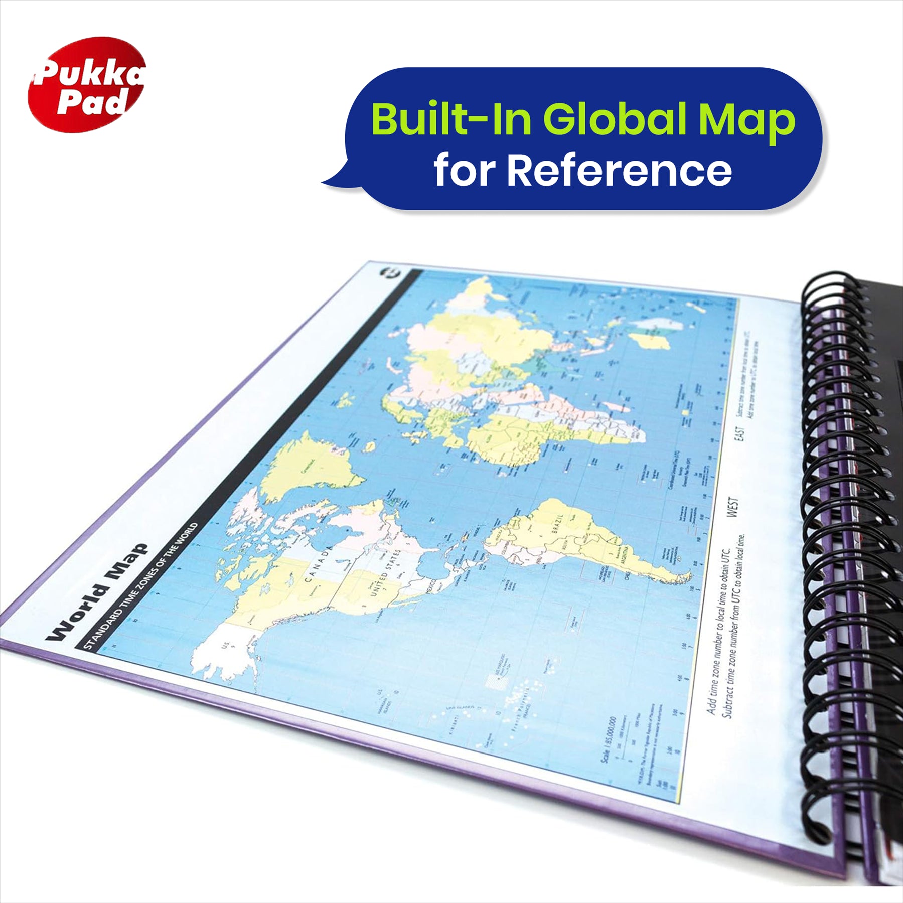 The Pukka Pad project book is made for those who juggle schedules, studies, or strategies. With bold, professional styling & a durable hardback notebook finish. This notebook looks like a professional journal notebook. Whether you're leading a team or tackling coursework, these notebooks combine form & function to elevate daily planning. Each spiral notebook includes 200 pages of thick lined paper, ideal for reducing distractions like ink bleed or ghosting. The ruled notebook format provides structure for detailed notes, lists, or sketches. With repositionable dividers & integrated pockets, it’s perfect as a task organiser or business meeting notebook. A global map reference adds a unique touch, while the elastic closure keeps pages secure, ideal for fast-paced environments where mobility matters. The A4 size gives more space than a standard note book . Use it as a study notebook, writing pad, or personal journal. The metallic notepad is ideal for thinkers & planners.