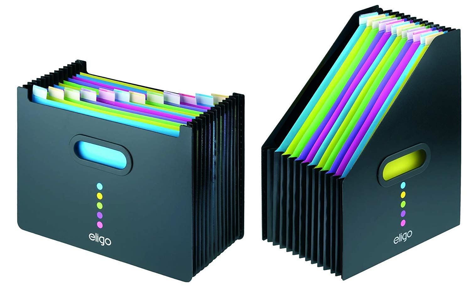Snopake 15174 Eligo 13 Part Desk Storage Expander A4 Landscape Black This elegant Snopake Eligo Desk Expander contains 13 compartments for organised filing. The unique expanding landscape design is ideal for use on a desk or shelf where space is limited. The file comes with carry handles for easy transportation and colour-coded insert tabs for indexing. The file is made from stylish, durable, 1.8mm thick black polypropylene and measures W320 x D65 x H255mm.