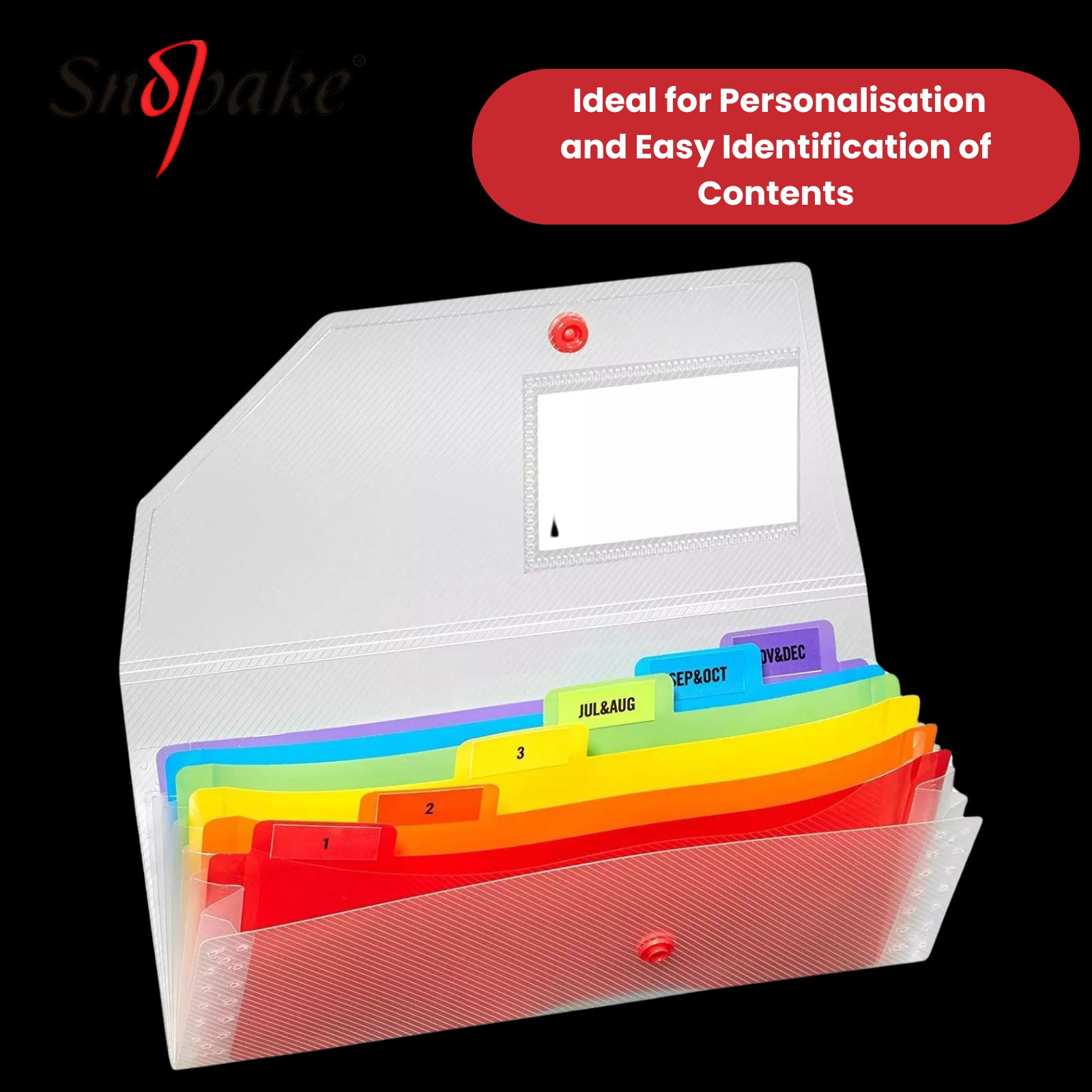 A bright and vibrant organiser with 6 colourful stepped dividers and index sticky labels allowing you to easily file, access and retrieve important documents