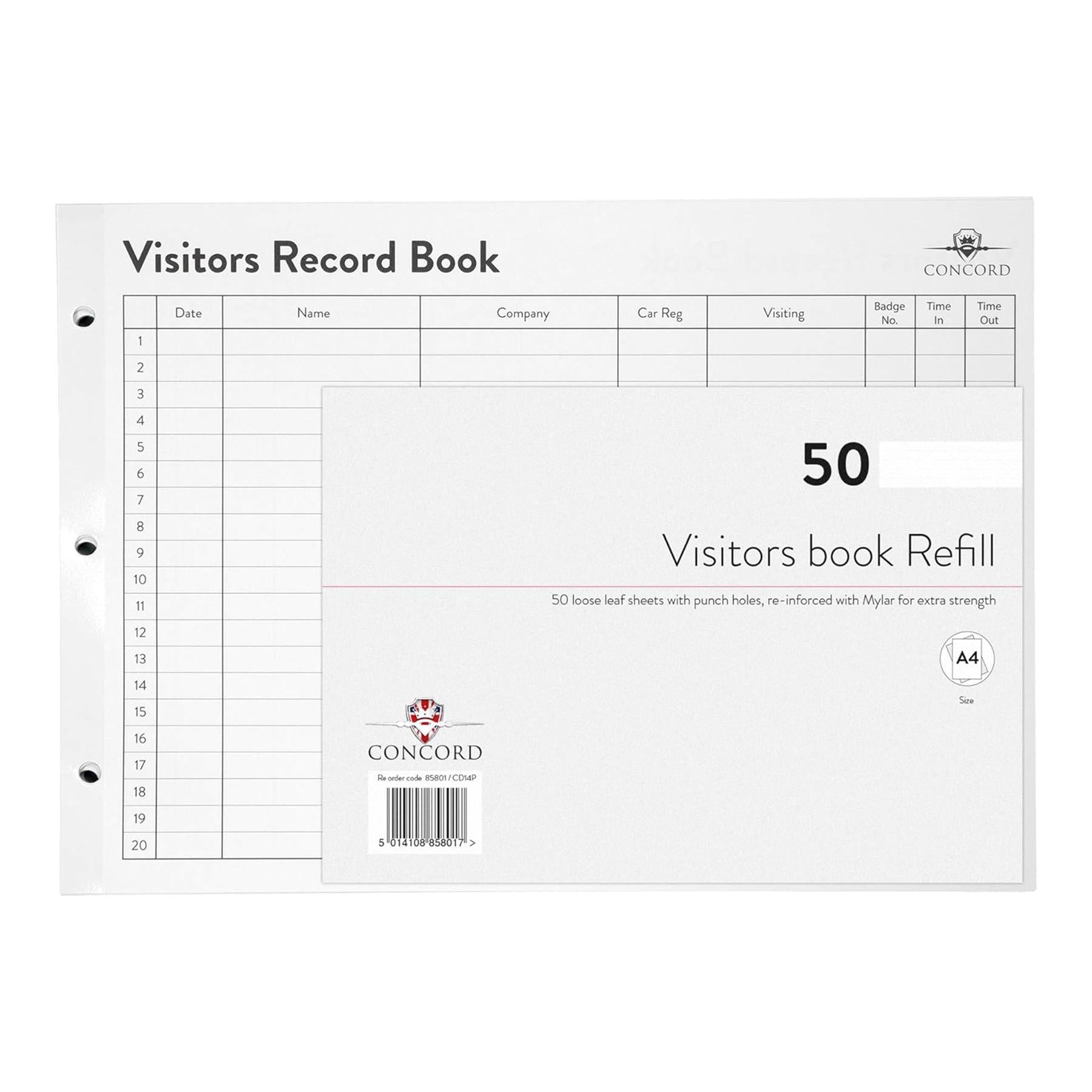REFILL DIMENSIONS - Our visitors book refill measures 230 x 355mm and includes 50 loose-leaf sheets, offering a large writing area for accurate record-keeping. Available in black print for professional visibility, this visitor log book refill is perfect for businesses, schools, hospitals, and reception areas requiring secure visitor documentation.