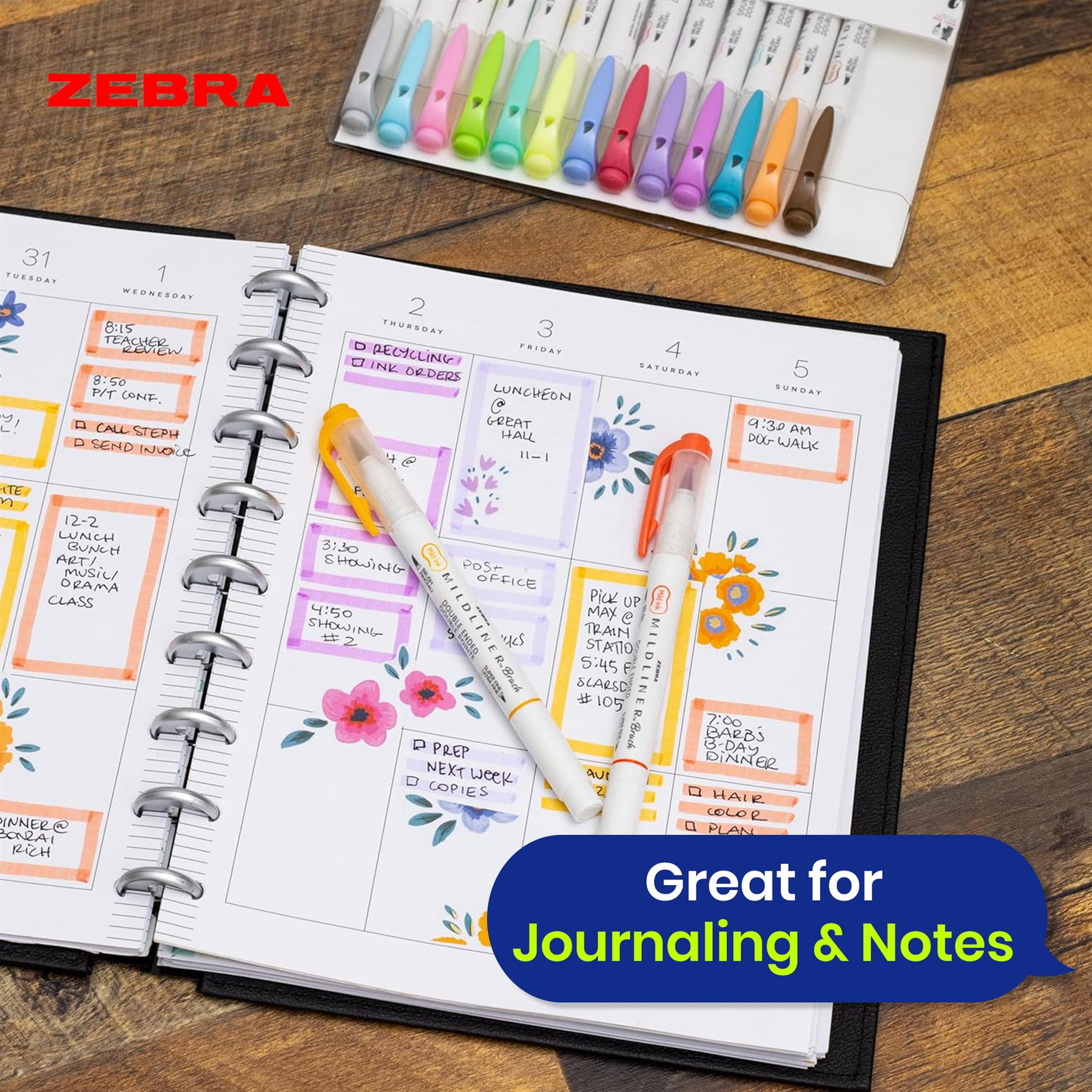 Our Zebra Mildliner dual-tip brush pens bring soft, functional colour to everyday writing and creative work. This 15-pack includes assorted pastel colours with a fine bullet tip and a broad brush tip on each pen. These are excellent dual-tip highlighters for journaling, calligraphy, adult colouring, and detailed drawing. The acid-free, water-resistant pigment ink dries fast and resists bleed-through, keeping pages neat.
